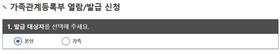 1) 발급 대상자가 본인인지 가족인지 선택해주세요.