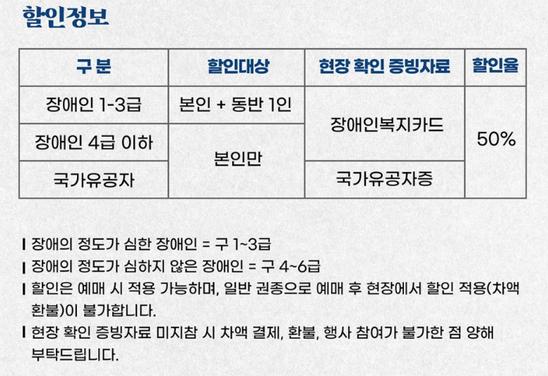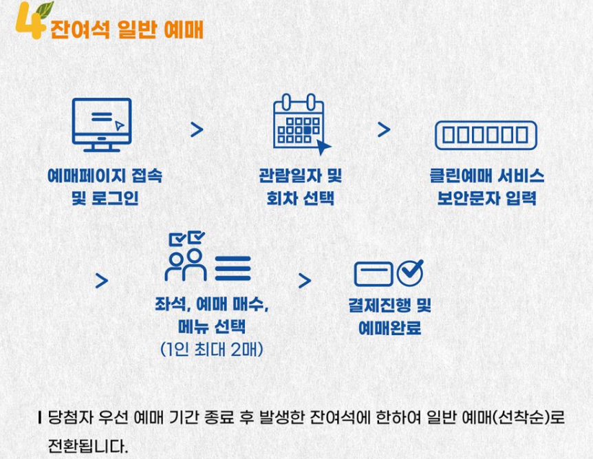 - 참고 사항: 행사 전일 12:00까지 예매 가능하며, 잔여석이 없을 경우 예매가 불가능할 수 있습니다.