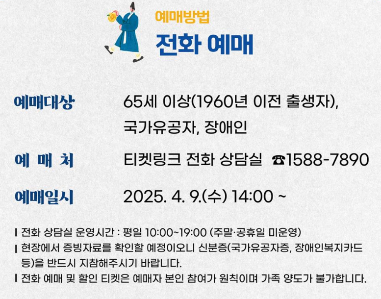 - 할인 혜택: 할인 대상자는 전화 예매를 통해 우선 예약이 가능합니다. 전화 예매는 2025년 4월 9일(수) 14:00부터 시작됩니다.