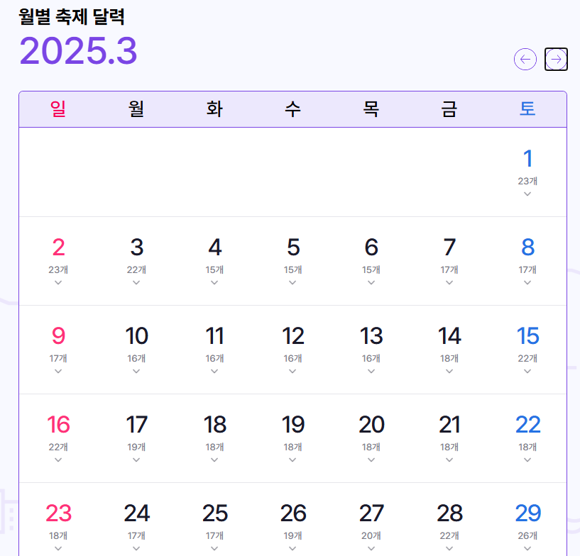 아래 사이트는 '대한민국 구석구석이라는 사이트' 입니다. 월별 축제가 달력에 적혀 있어 한눈에 파악하기 쉽습니다.