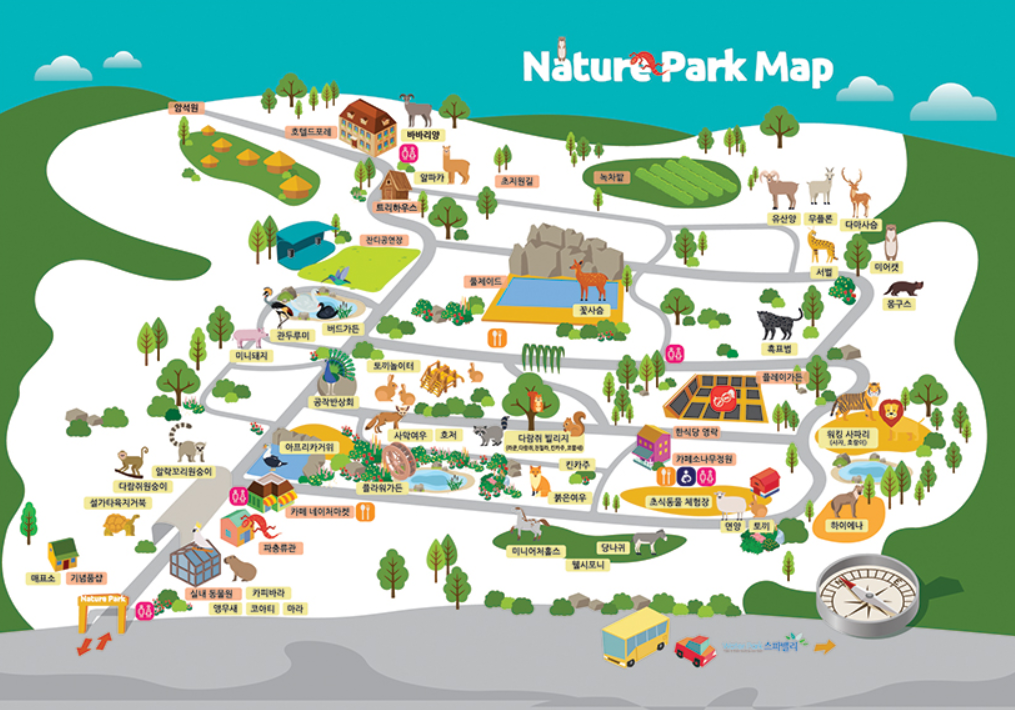 네이처파크는 100% 리얼 자연 교감형 생태동물원으로 12만 평 부지의 식물원 내 초대형 글라스하우스 동물원과 방사형 야외 동물원으로 구성되어 있습니다. 50여 종, 300마리 이상의 동물, 350여 종의 수목, 100여 종 이상의 다양한 꽃들이 공존하는 전국 최초 교감형 생태 동물원입니다.
