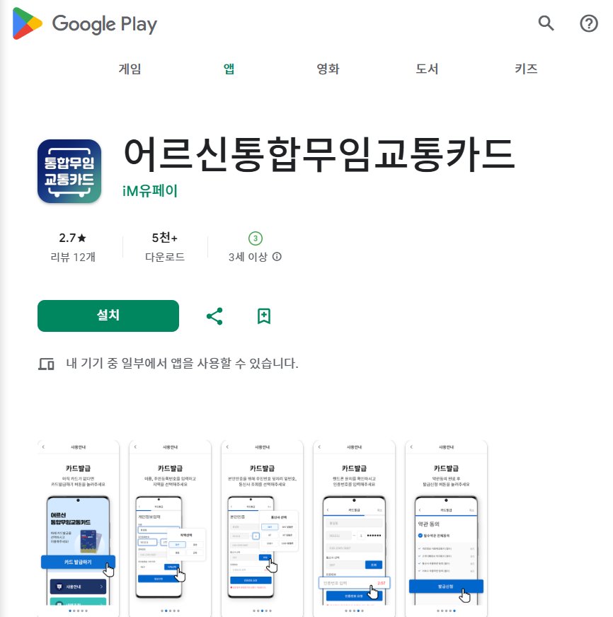 개인 스마트폰을 이용하여 '어르신 통합무임 교통카드 앱' 설치 및 회원가입을 진행합니다.