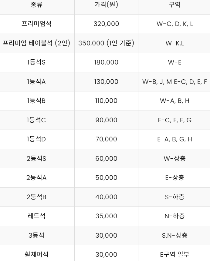 티켓 가격은 프리미엄석 32만원부터 3등석 3만원까지 구성 되어 있습니다. 자세한 가격은 아래표를 참고해주시길 바랍니다.