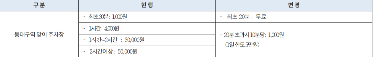요금: 최초 20분 무료 / 20분 초과시 10분당 1,000원 / 1일 주차 최대 50,000원