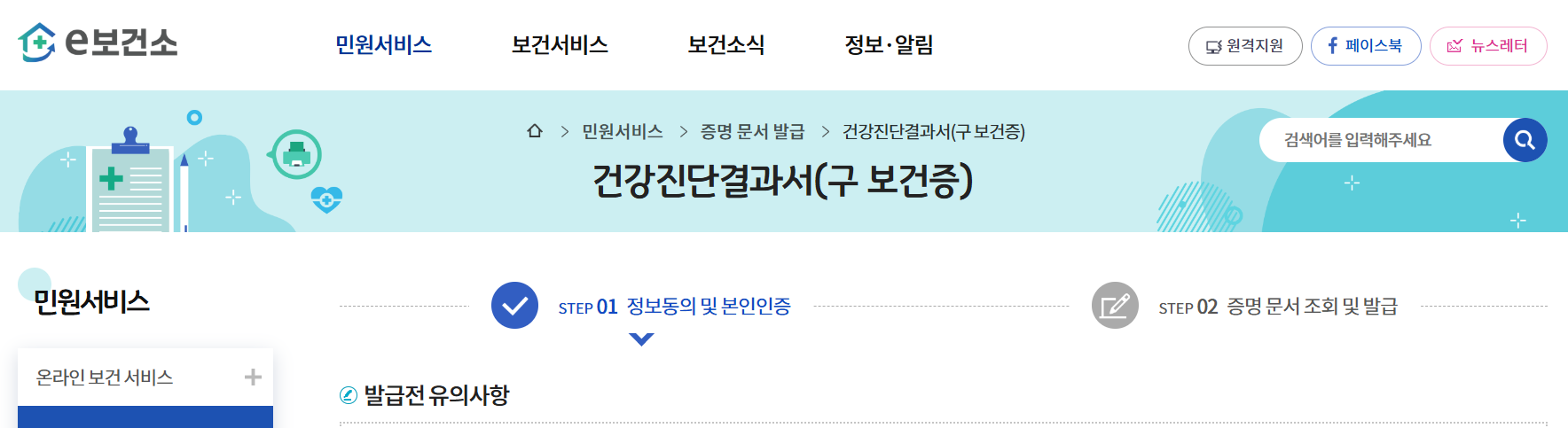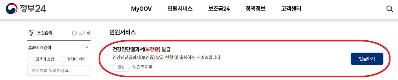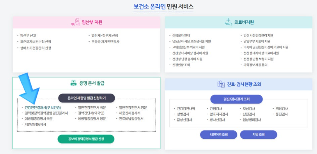 검색창에 '건강진단결과서(구 보건증)' 입력 후 클릭