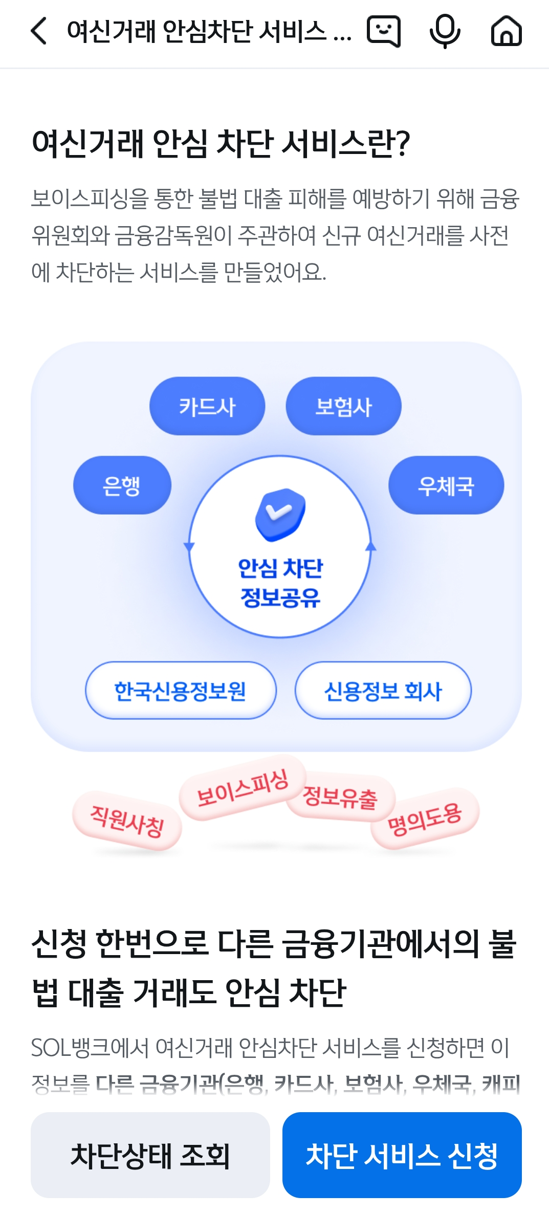 | 신한은행 | 쏠(SOL) 앱 > 보안·인증 > 금융사기예방 > 여신거래 차단 서비스 |