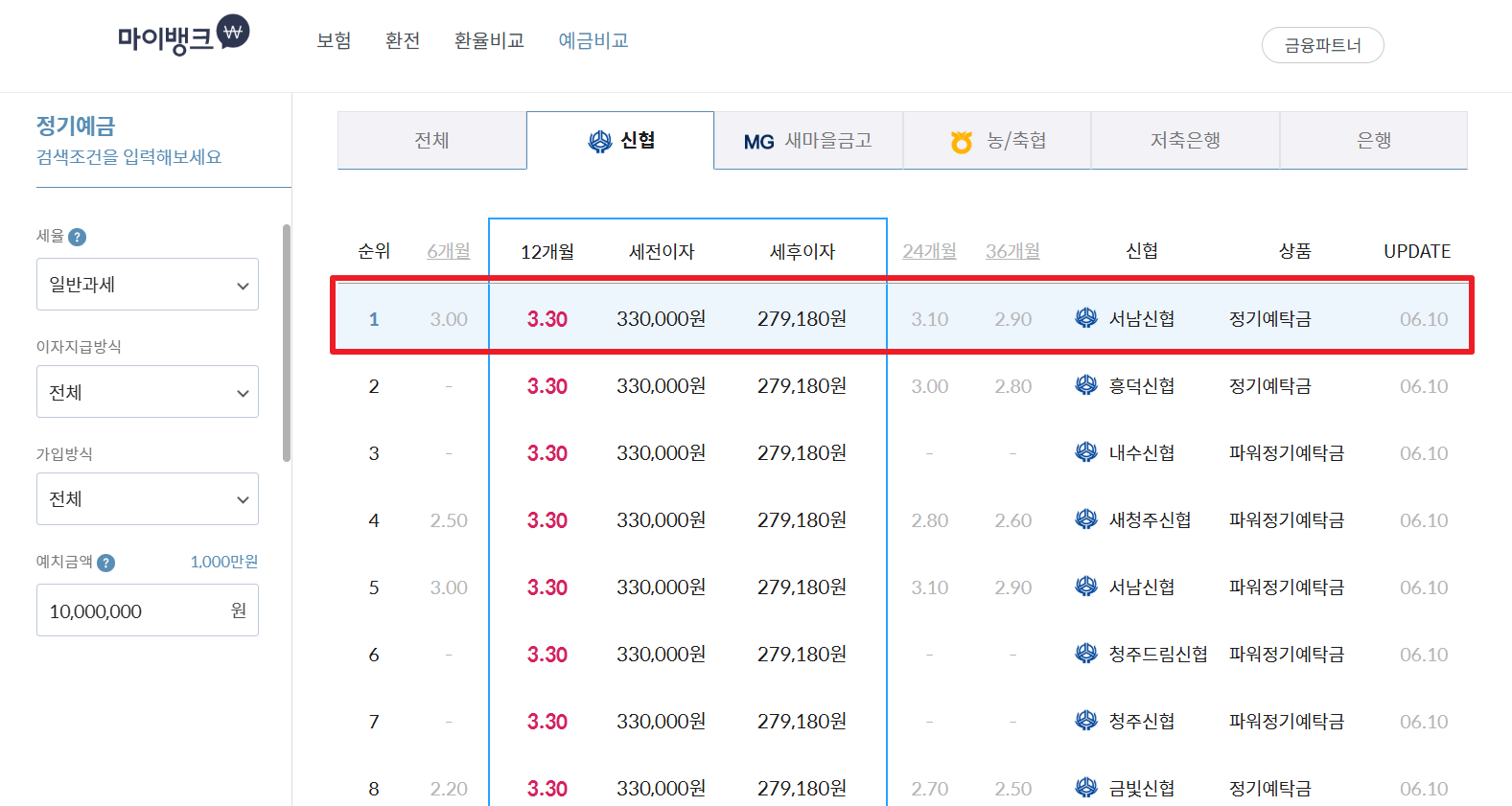 신협의 경우, 일부 금리 비교 플랫폼에서는 높은 금리가 공시되는 경우가 있습니다. 예를 들어, 서남 신협의 경우 6월 10일 기준 3.3%의 금리를 보이고 있습니다.