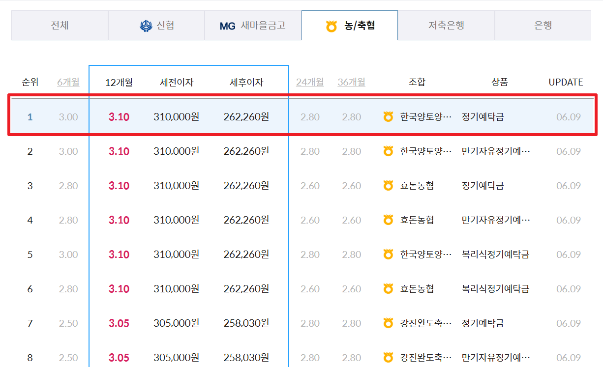 한국양토양록농협 정기예금은 6월 9일 기준으로 3.10% 수준의 금리를 제공했습니다. 1,000만 원 예치 시 세전 약 31만 원의 이자 수익을 기대할 수 있습니다.