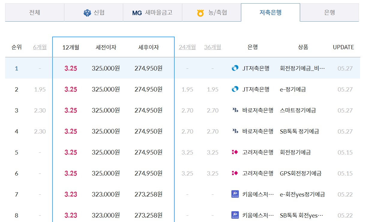 일부 금리 비교 사이트에 등록된 3.25% 수준의 상품 정보는 대부분 금리 인하 이전에 공시된 정보이며, 5월 기준금리 인하 이후 금리 조정 반영이 늦어지고 있는 경향이 있습니다.