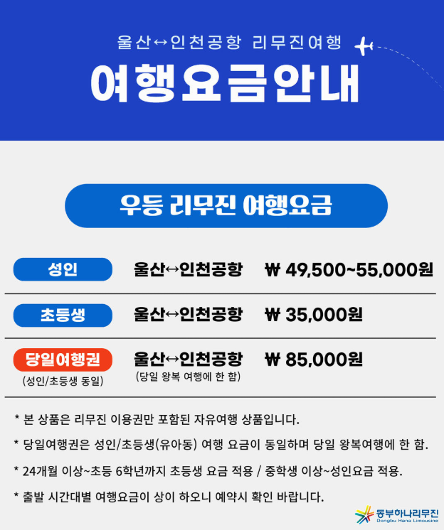 | 성인 | 울산 <-> 인천공항 | 49,500원 ~ 55,000원 |