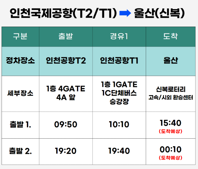 1) 09:50(인천공항 터미널 2 출발) / 10:10(인천공항 터미널 1 출발) - 15:40 울산 도착