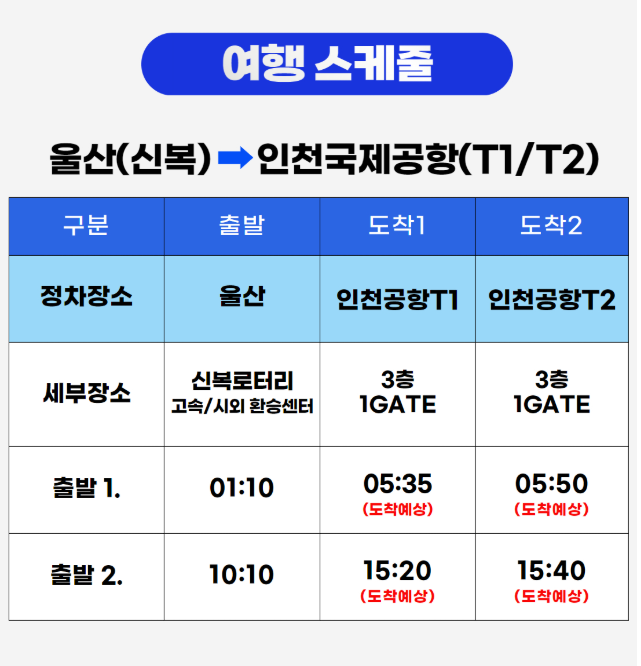 1) 01:10 울산 출발 - 05:35(인천공항 터미널 1 도착) / 05:50(인천공항 터미널 2 도착)