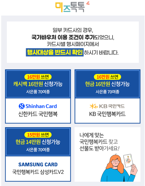 저는 처음에 아무 정보 없이 카드사에 직접 신청하려다, 신한카드 국민행복카드 이벤트를 진행 중인 미즈톡톡 사이트를 발견하고 현금 사은품을 노려보게 되었어요. 하지만 중간에 잘못 신청하는 바람에 재발급까지 하게 된 사연을 공유드릴게요. 같은 실수 없이 알뜰하게 혜택 챙기세요!