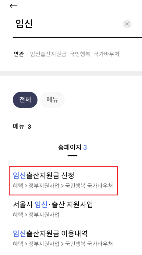 - ‘임신’ 검색 → 임신출산지원금 신청 탭