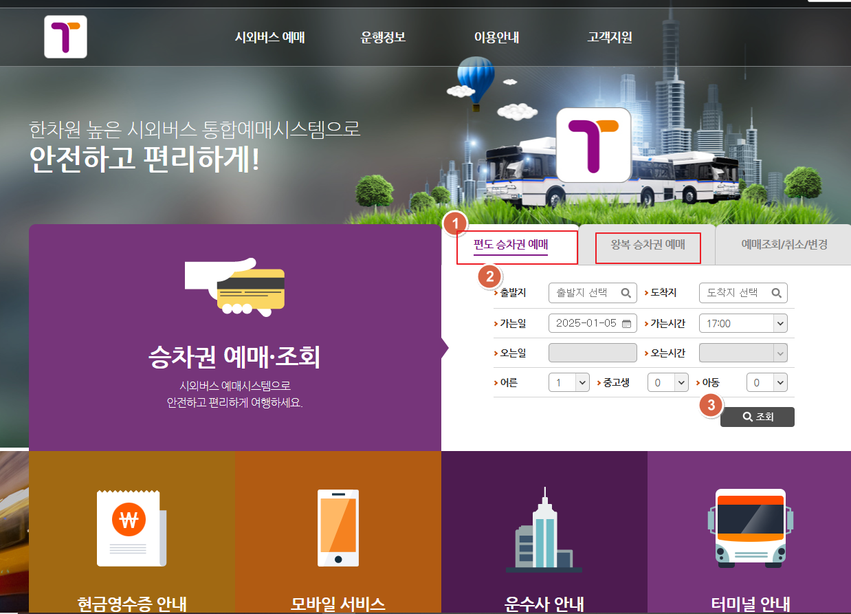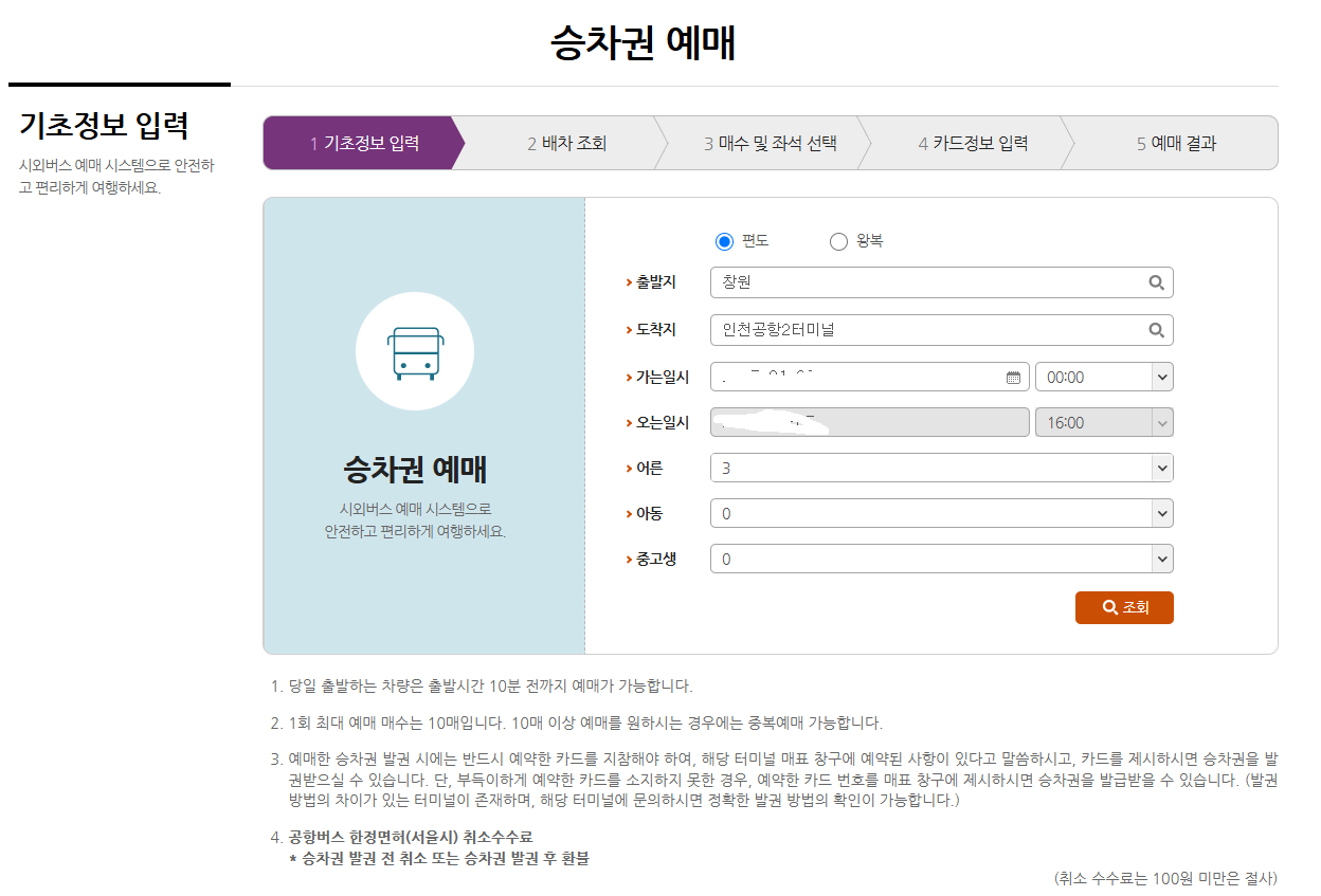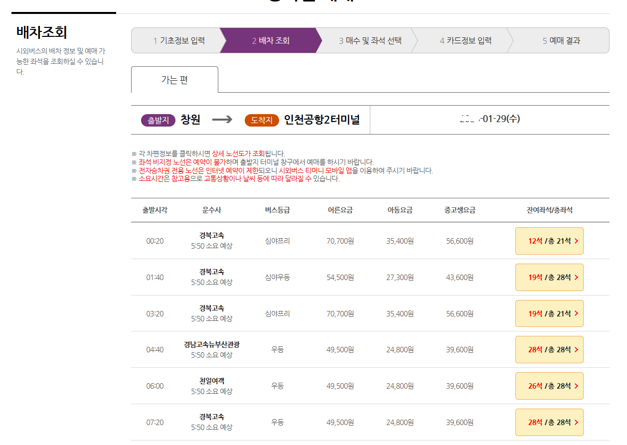 1) 출발지(창원 또는 마산) 도착지(인천공항 1터미널 또는 2터미널)을 설정