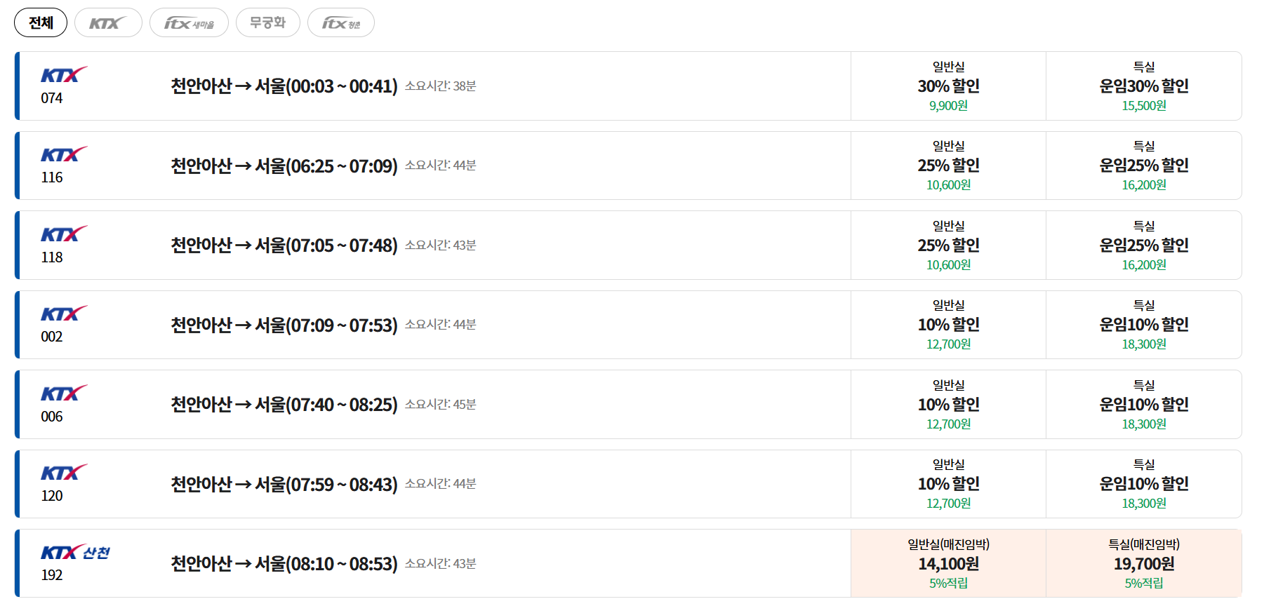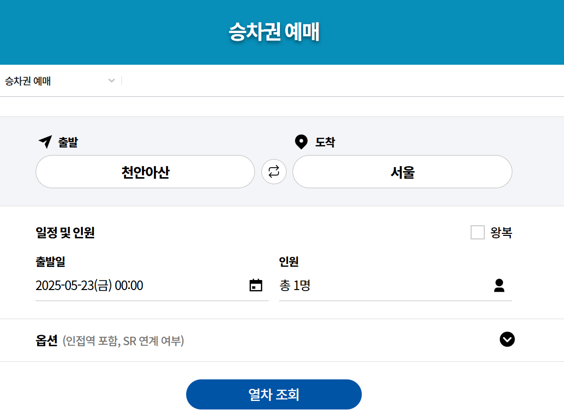 💡 ‘출발역: 천안아산’, ‘도착역: 원하는 역’으로 검색 후 날짜와 시간을 설정하면 상세한 시간표와 잔여석을 확인할 수 있습니다.