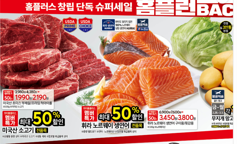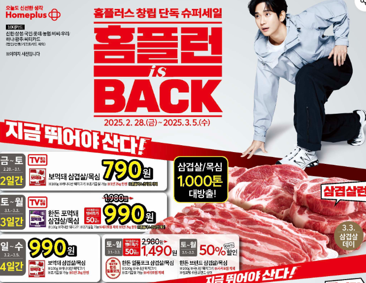 - 3/2(일) ~ 3/5(수) 보먹돼 삼겹살 / 목심 100g 990원 (1인 2kg 한정)