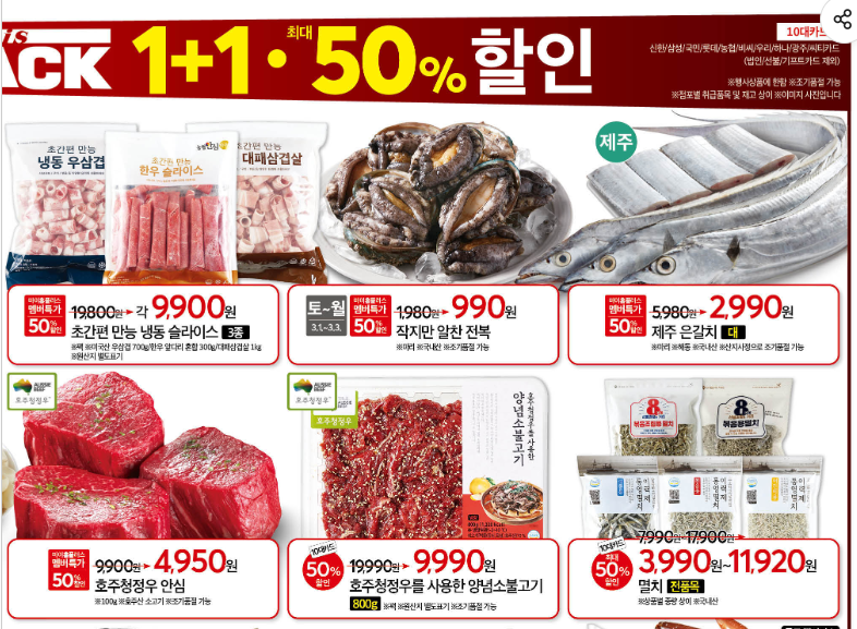- 3/1(토) ~ 3/3(월) 한돈 브랜드 삼겹살 / 목심 50% 할인 ( 10대 카드 결제 시, 서귀포점 제외 )