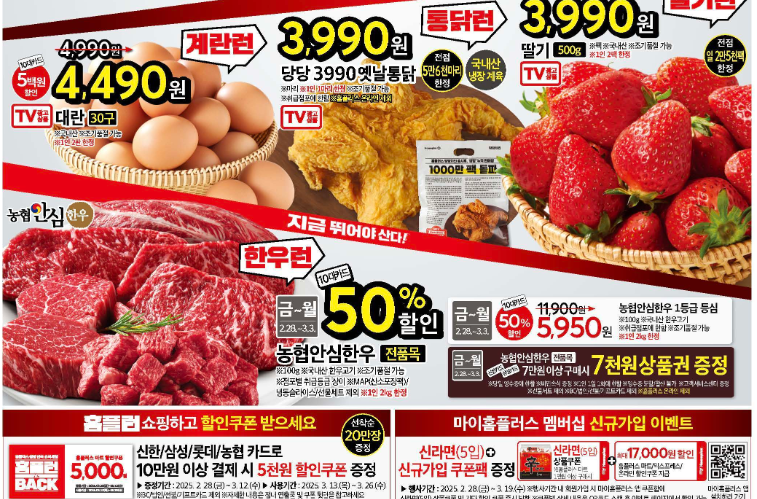 - 농협안심한우 1등급 등심 50%할인 5,950원 ( 2/28(금) ~ 3/3(월)까지. 1인 2kg 한정 )