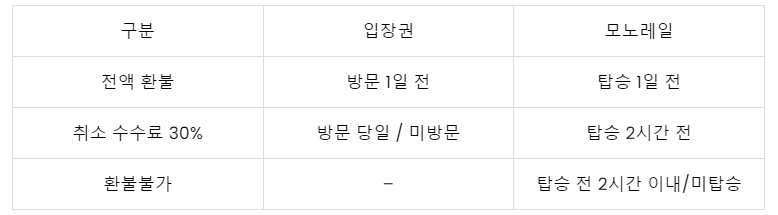 - 모노레일 요금 - 1구간 (약 5분): 성인·경로·청소년 5,000원, 어린이 4,000원 - 2구간 (약 10분): 성인·경로·청소년 7,000원, 어린이 6,000원 - 순환 (약 20분): 성인·경로·청소년 9,000원, 어린이 7,000원