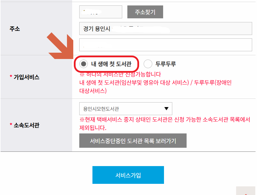 '내 생애 첫 도서관' 클릭 후 서비스 가입하시면 됩니다.
