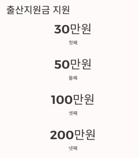 - 지원 금액:첫째 30만 원 / 둘째 50만 원 / 셋째 100만 원 / 넷째 200만 원 / 다섯째 이상 300만 원