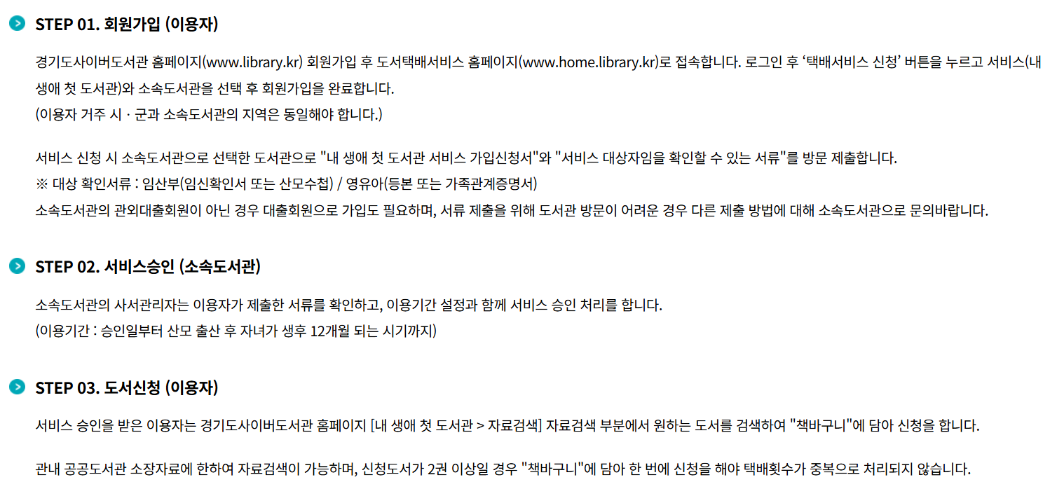 - 신청: 경기도 사이버도서관 회원가입 및 도서관 서비스 '내 생애 첫 도서관' 가입