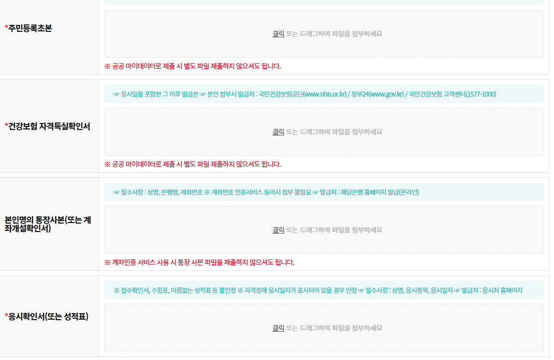 필요 서류는 위와 같은데요, 공공 마이데이터로 서류 제출하시면 결제영수증과 응시확인서(또는 성적표)만 제출하면 신청 완료됩니다.