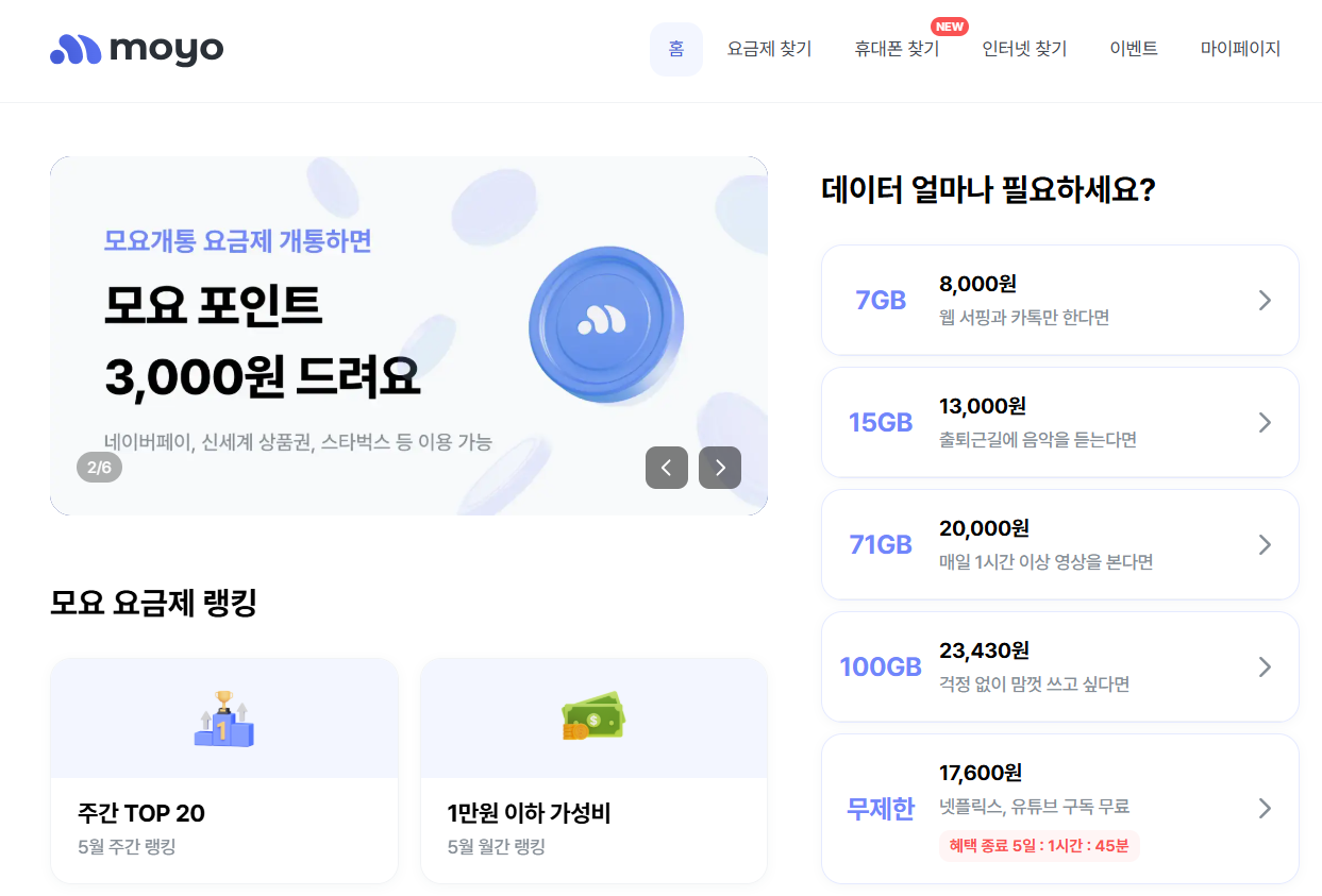 1. 모요 (모두의 요금제): 다양한 알뜰폰 요금제를 조건별로 필터링하여 비교할 수 있는 플랫폼입니다.