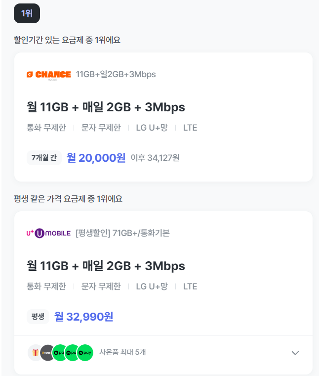 | 월 11GB + 일 2GB | 매일 1시간 이상 영상 시청하는 사용자 |