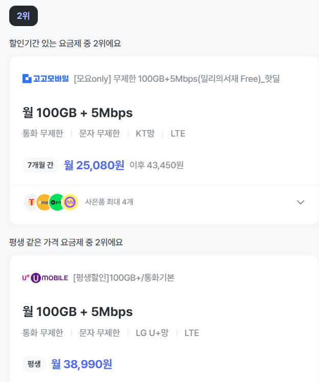| 월 1GB | 데이터 및 통화 사용이 적은 사용자 |